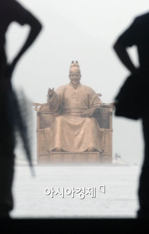 [아시아경제 이재문 기자]서울을 비롯한 수도권과 충청지방에 장대비가 내리는 가운데 26일 오후 서울 광화문광장을 지나는 시민의 팔이 세종대왕 동상에 걸쳐 잡.