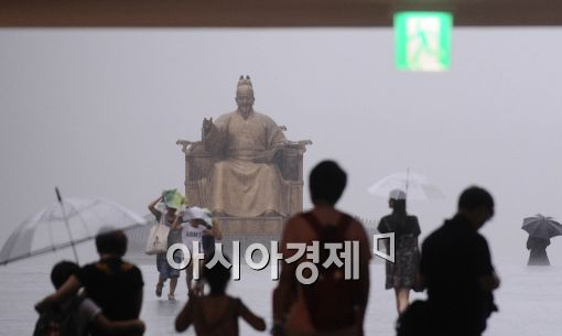 [아시아경제 이재문 기자]서울을 비롯한 수도권과 충청지방에 장대비가 내리는 가운데 26일 오후 서울 광화문광장 밑에서 바라본 세종대왕 동상이 비상구 표시에 걸려 뛰라는 듯한 이색풍경을 연출하고 있다.