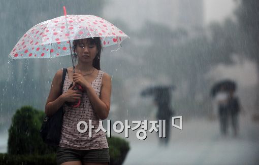 [아시아경제 이재문 기자]서울을 비롯한 수도권과 충청지방에 장대비가 내리는 가운데 26일 오후 서울 광화문네거리에서 시민들이 우산을 쓰고 지나고 있다.