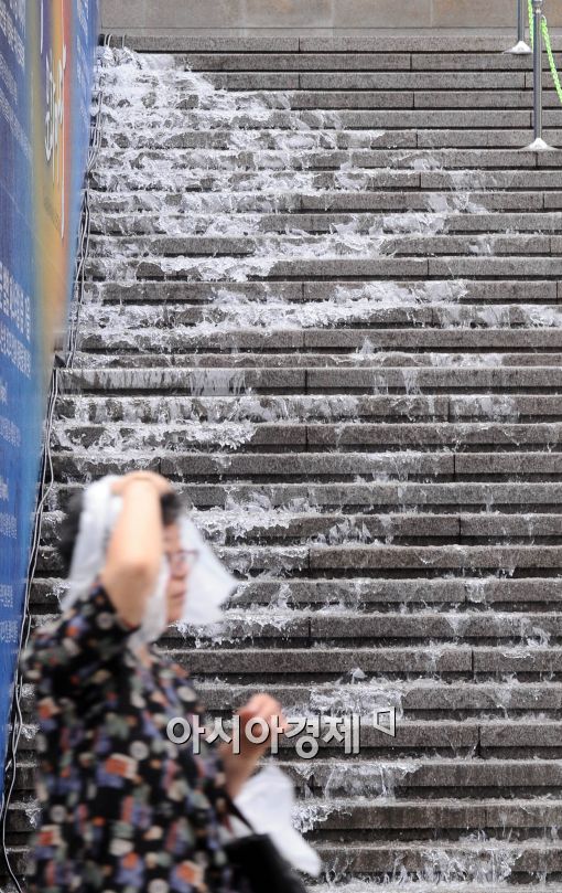 [아시아경제 이재문 기자]서울을 비롯한 수도권과 충청지방에 장대비가 내리는 가운데 26일 오후 서울 세종문화회관 계단에 많은 빗물이 흐르고 있다.