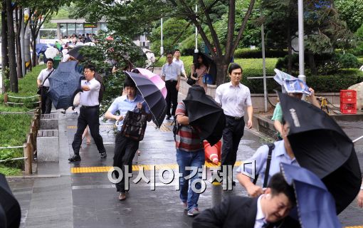 [아시아경제 이재문 기자]제9호 태풍 무이파의 영향으로 수도권에 태풍 경보가 내려진 가운데 8일 오전 서울 여의도에서 출근길 시민들이 걸음을 서두르고 있다.