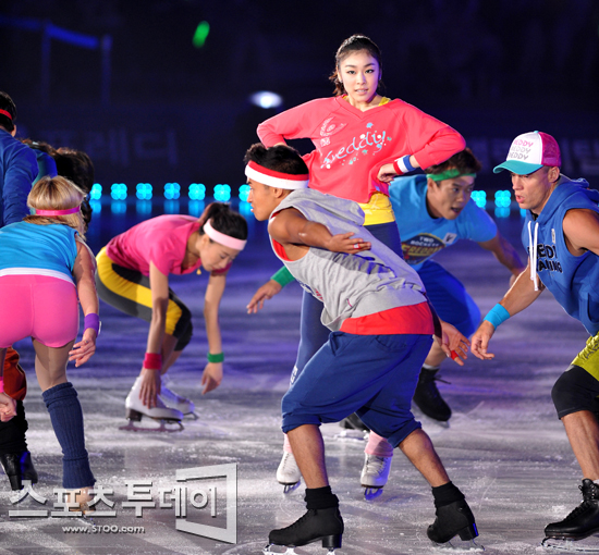 [스포츠투데이 정재훈 기자] '피겨여왕' 김연아와 세계 최고 스케이터들이 13일 오후 올림픽공원 체조경기장 특설무대에서 열린 '김연아 아이스쇼-2011 삼성 갤럭시★하우젠 올댓스케이트 서머' 오프닝 무대를 펼치고 있다.