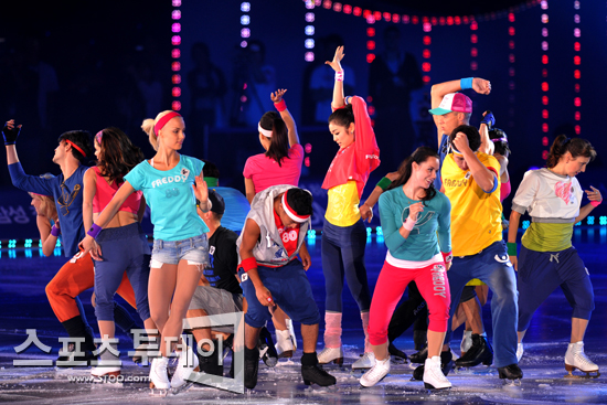 [스포츠투데이 정재훈 기자] '피겨여왕' 김연아와 세계 최고 스케이터들이 13일 오후 올림픽공원 체조경기장 특설무대에서 열린 '김연아 아이스쇼-2011 삼성 갤럭시★하우젠 올댓스케이트 서머' 오프닝 무대를 펼치고 있다.