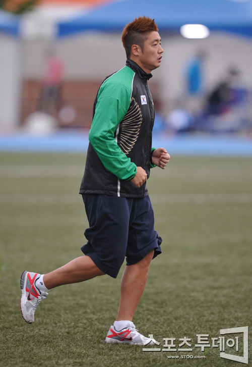 [대구=스포츠투데이 정재훈 기자] 2011 대구세계육상선수권대회 출전을 위해 세계 각지에서 모인 육상선수들이 23일 오후 율하동 선수촌 훈련장에서 훈련을 가졌다. 창던지기 정상진이 트랙을 돌며 몸을 풀고 있다.