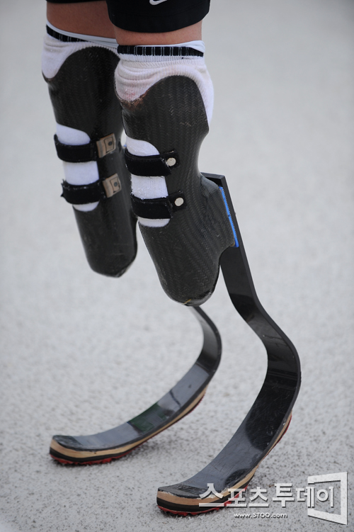 [대구=스포츠투데이 정재훈 기자] 오스카 피스토리우스(24, 남아공)가 24일 오전 율하동 선수촌 훈련장에서 연습에 앞서 취재진과 인터뷰에 응하고 있다. 사진은 피스토리우스의 의족.