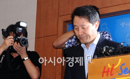 [아시아경제 이재문 기자]오세훈 서울시장이 26일 오전 서울 시청별관 브리핑실에서 시장직 사퇴와 관련한 기자회견을 하고 있다.