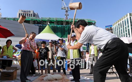 [아시아경제 이재문 기자]31일 오후 서울광장에서 열린 ‘2011농수특산물 한마당장터’를 찾은 시민들이 떡메치기 체험을 하고 있다. 이번 농수특산물 한마당장터는 다음달 4일까지 서울광장과 청계광장에서 열린다.