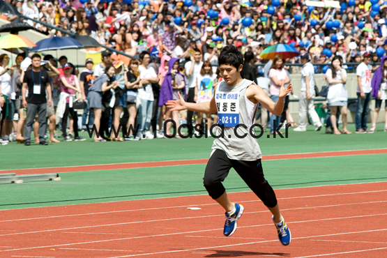 이건 운동회일까, 올림픽일까. 이른 아침이라고는 믿기지 않을 만큼 뜨거운 태양이 내리쬐던 8월 28일 오전 9시, 하늘색부터 초록색까지 색색의 티셔츠를 맞춰 입은 아이돌스타들이 <제 3회 아이돌 스타 육상 선수권 대회>가 열리는 잠실종합운동장 주경기장을 가로지른다. 가만히 있어도 땀이 솟는 무더위건만, 오랜만에 “킬 힐과 깔창을 벗어 던진” 이들의 들뜬 발걸음은 “죄송합니다. 선수들 입장하는 것 다시 찍겠습니다”라는 PD의 말에도 처질 줄을 모른다. 오히려 올림픽을 보는 듯 비장한 건 관객석을 채운 팬들이다. 특히 조용히 트랙을 응시하던 B1A4의 팬들은 경기가 임박하자 박자에 맞춰 칼 같이 ‘B~1A4!’를 외치며 들고 있던 노란 바를 힘차게 두드린다. 이 함성을 뚫고 가장 먼저 등장한 건 스티비 원더로 변신한 붐과 슈퍼주니어의 이특, 은혁, 신동이다. “드럼 스틱 좀 갖다 주세요”(붐)라거나 “엠프 좀”(이특)이라고 말하던 이들은, 결국 MR에 맞춰 과장된 제스처를 취하며 사람들을 웃긴다.
