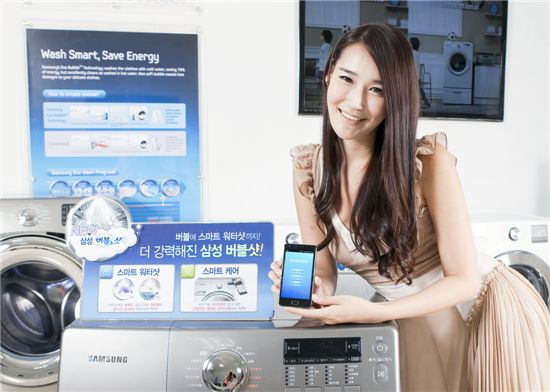 $pos="C";$title="";$txt="삼성전자는 세탁기를 사용하는 소비자가 스마트케어 어플리케이션을 사용해 세탁기의 정상 여부를 확인하고, 고장 상황에서 매뉴얼 없이 빠르게 대처할 수 있도록 하는 '스마트케어' 기능을 하반기 버블샷 드럼세탁기 전 제품에 적용한다. 삼성전자 모델이 수원 삼성전자 생활가전사업부 제품 전시장에서 스마트 버블샷 신제품을 선보이고 있다.