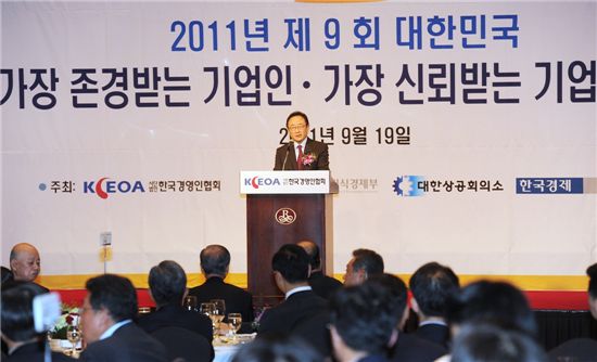 [아시아경제 이창환 기자] 사공일 한국무역협회 회장(사진)은 19일 한국경영인협회(회장 고병우)가 주관한 '가장 존경받는 기업인, 가장 신뢰받는 기업 시상식' 축사에서 한국 기업들의 사회적 책임을 강조했다.