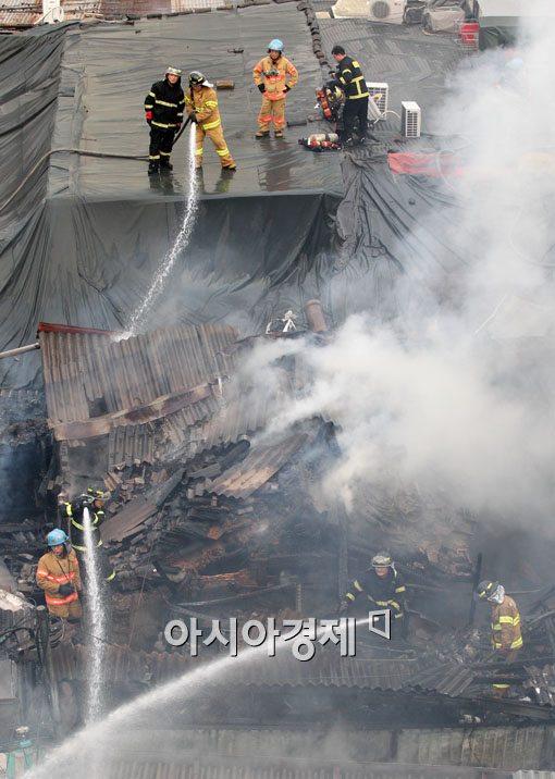[아시아경제 윤동주 기자] 28일 서울 종로구 관수동의 한 상가건물에서 화재가 발생해 긴급 출동한 소방대원들이 불을 끄고 있다.