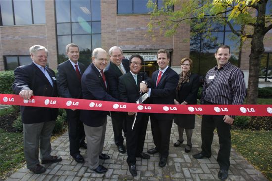 LG전자는 28일(현지시간) 미국 시카고에서 북미 최초 생활가전 R&D센터인'HA(Home Appliance) R&D 센터' 개소식을 열었다. 북미지역대표 겸 미국법인장 박석원 부사장(오른쪽에서 4번째), 로버트 돌드 미 국회의원(오른쪽에서 3번째)), 데니스 시엔코 일리노이 상무성 디렉터(왼쪽에서 4번째))등 행사에 초청된 VIP가 HA R&D센터 앞에서 리본 커팅식을 하고 있다.
