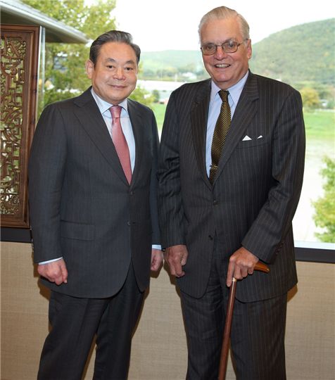 [아시아경제 박성호 기자]이건희 회장이 지난 3일 오후 미국 뉴욕주 코닝시에 위치한 코닝 본사를 방문해 제임스 호튼(James Houghton) 명예회장과 면담했다.