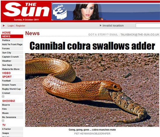 공개된 사진에는 붉은 빛을 띠는 코브라가 자기 몸체만한 독사를 한입에 삼키고 있다. 언뜻 봐도 믿기 어려운 광경.
