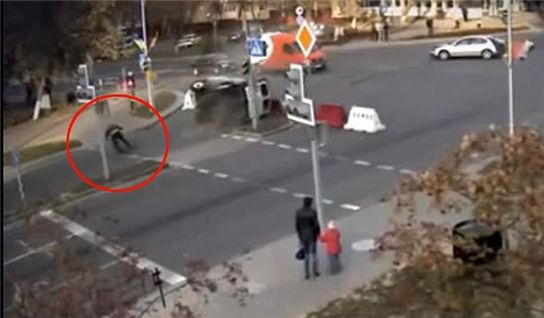 한 4거리에서 고속 질주하던 경찰 밴이 왼쪽에서 달려오는 흰색 승용차에 옆구리를 받쳐 운전하던 경관이 밴에서 튕겨져 나갔으나 기적적으로 멀쩡히 살아 벌떡 일어난 것.