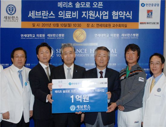 해당 후원금은 오는 13일부터 여주 솔모로 컨트리클럽에서 열리는 '2011 메리츠 솔모로 오픈' 대회를 맞이해 공식 후원사인 한진중공업그룹과 주최사인 메리츠금융그룹이 마련한 금액이다.