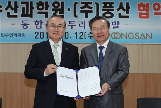 풍산은 12일 울산 동가공공장 강당에서 국립수산과학원과 ‘동 합금소재를 적용한 바다양식용 동합금 가두리망 개발’ 협약식을 가졌다고 밝혔다. 협약식에는 최한명 풍산 대표이사와 김영만 국립수산과학원 원장 등이 참석했다.
