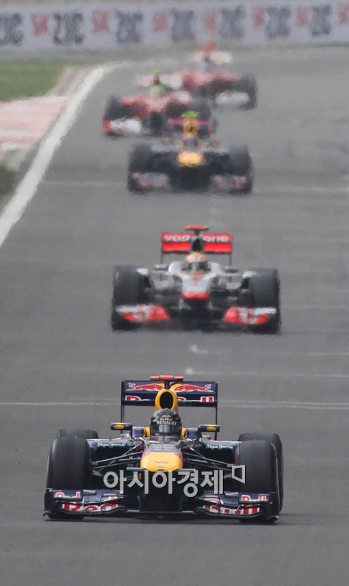 [영암=사진공동취재단] 16일 오후 전남 영암군 삼호읍 코리아 인터내셔널 서킷(KIC)에서 열린 '2011 포뮬러원 코리아 그랑프리(2011 FORMULA1 KOREAN GRAND PRIX)' 결승에서 머신들이 질주하고 있다.