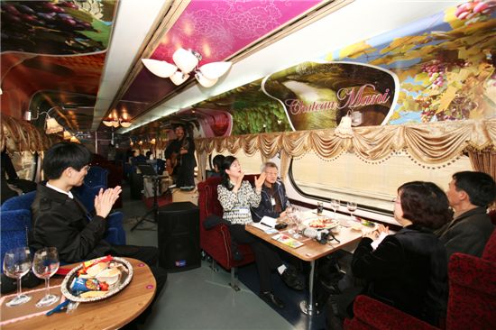와인객차에선 와인 무료테이스팅, 와인강좌, 라이브 공연, 신나는 레크레이션이 펼쳐지고 시네마객차에선 최신 개봉영화를 보여준다.