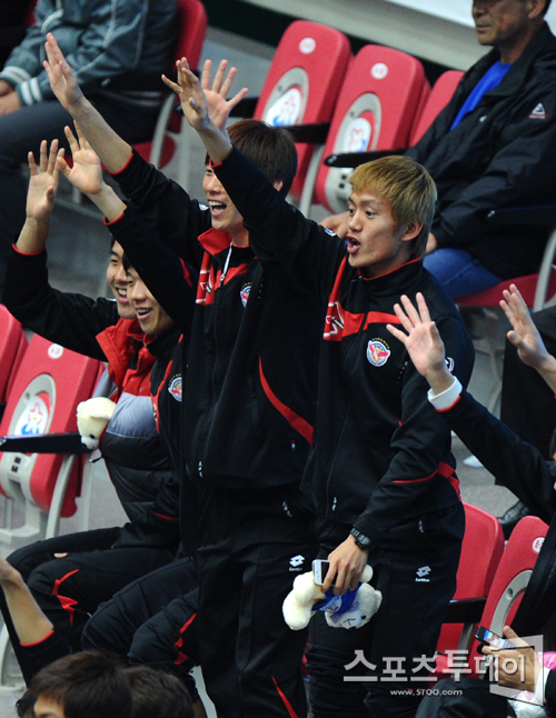 [성남=스포츠투데이 정재훈 기자] 성남일화 홍철이 25일 오후 성남실내체육관에서 열린 'NH 농협 2011-2012 V리그 여자부' 도로공사와 흥국생명의 경기를 관람하던 도중 선물 증정 이벤트에 일어나 손을 흔들고 있다.