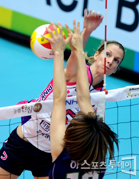 [성남=스포츠투데이 정재훈 기자] 25일 오후 성남실내체육관에서 열린 'NH 농협 2011-2012 V리그 여자부' 도로공사와 흥국생명의 경기에서 흥국생명 미아의 공격이 도로공사 하준임의 블로킹에 의해 저지당하고 있다.