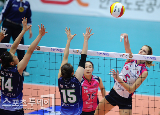 [성남=스포츠투데이 정재훈 기자] 25일 오후 성남실내체육관에서 열린 'NH 농협 2011-2012 V리그 여자부' 도로공사와 흥국생명의 경기에서 흥국생명 미아가 공격을 시도하고 있다.
