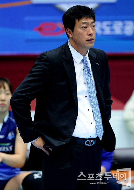 [성남=스포츠투데이 정재훈 기자] 25일 오후 성남실내체육관에서 열린 'NH 농협 2011-2012 V리그 여자부' 도로공사와 흥국생명의 경기에서 어창선 도로공사 감독이 굳은 표정으로 경기를 지켜보고 있다.