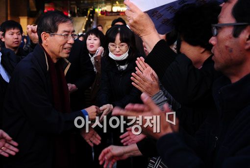 [아시아경제 양지웅 기자] 10·26 서울시장 보궐선거를 하루 앞둔 25일 범야권 박원순 서울시장 후보가 서울 성동구 왕십리 민자역사 앞에서 가진 집중유세 현장.