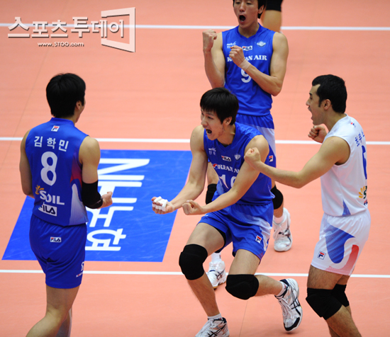 [성남=스포츠투데이 정재훈 기자] 25일 오후 성남실내체육관에서 열린 'NH 농협 2011-2012 V리그 남자부' 상무 신협과 대한항공의 경기에서 김학민의 득점에 동료들이 함께 기뻐하고 있다.