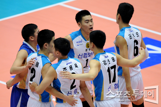 [성남=스포츠투데이 정재훈 기자] 25일 오후 성남실내체육관에서 열린 'NH 농협 2011-2012 V리그 남자부' 상무 신협과 대한항공의 경기에서 득점에 성공한 상무 신협 선수들이 환호하고 있다.