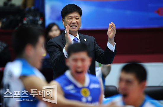 [성남=스포츠투데이 정재훈 기자] 25일 오후 성남실내체육관에서 열린 'NH 농협 2011-2012 V리그 남자부' 상무 신협과 대한항공의 경기에서 최삼환 상무 감독이 2세트를 따낸 선수들을 향해 박수를 치고 있다.