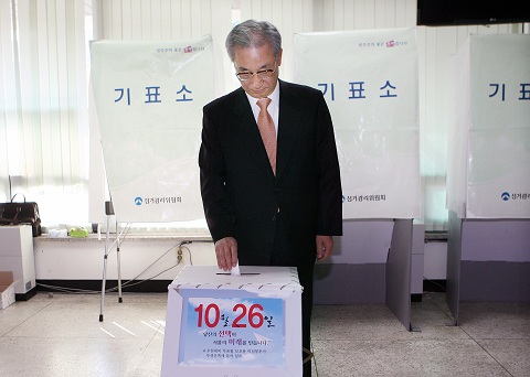 [아시아경제 정준영 기자]이강국 헌법재판소장이 재보궐 선거일인 26일 오전 서울 종로구 삼청동 주민센터에 마련된 투표소를 찾아 투표를 하고 있다.