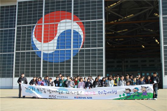 [아시아경제 조슬기나 기자]대한항공은 26일부터 28일까지 강서구 저소득층 자녀 및 공항 인근지역 어린이들을 대상으로 항공 체험 및 제주견학 행사를 실시한다. 행사에 초청된 어린이들이 서울 공항동 대한항공 본사 격납고 앞에서 기념 촬영을 하고 있다.