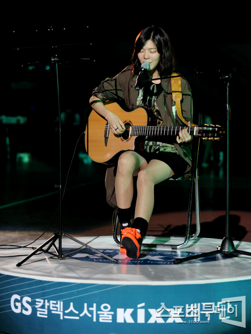 [스포츠투데이 정재훈 기자] 27일 오후 서울 장충체육관에서 'NH 농협 2011-2012 V리그' 여자부 GS칼텍스와 KGC 인삼공사의 경기에 앞서 가수 장재인이 축하공연을 펼치고 있다.