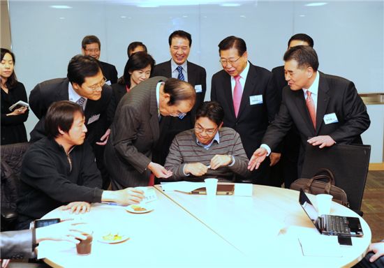 $pos="C";$title="포스코 벤처 아이디어 큰 장 섰다";$txt="정준양 포스코 회장(앞줄 오른쪽 두번째)과 윤종용 국가지식위원장(앞줄 오른쪽 네번째)이 아이디어 멘토링 부스에 들러 우수 아이디어 제안자의 제안서를 살피며 벤처창업을 지원독려하고 있다.