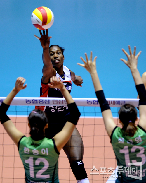 [스포츠투데이 정재훈 기자] 27일 오후 서울 장충체육관에서 'NH 농협 2011-2012 V리그' 여자부 GS칼텍스와 KGC 인삼공사의 경기에서 인삼공사 몬타뇨가 공격을 시도하고 있다.