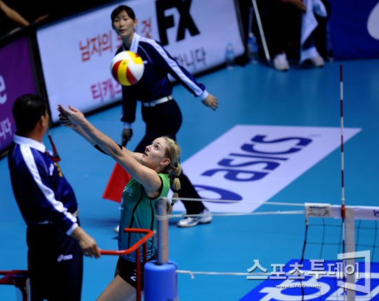 [스포츠투데이 정재훈 기자] 27일 오후 서울 장충체육관에서 'NH 농협 2011-2012 V리그' 여자부 GS칼텍스와 KGC 인삼공사의 경기에서 스파이크 기회를 놓친 GS칼텍스 페리가 공을 네트 너머로 넘기고 있다.