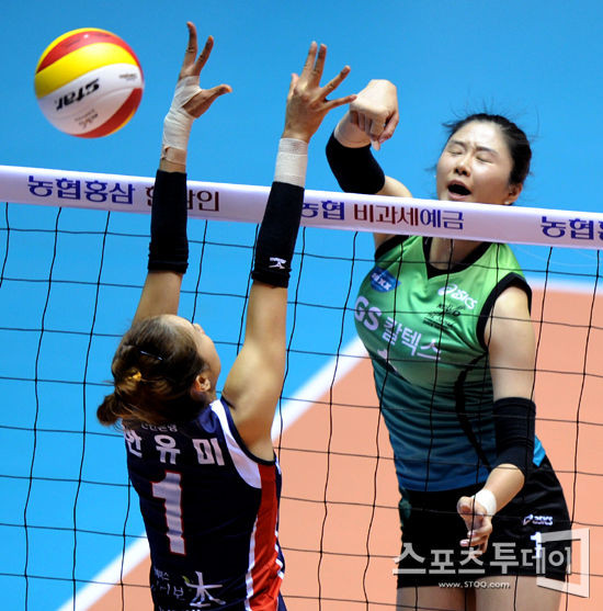 [스포츠투데이 정재훈 기자] 27일 오후 서울 장충체육관에서 'NH 농협 2011-2012 V리그' 여자부 GS칼텍스와 KGC 인삼공사의 경기에서 GS칼텍스 김민지가 공격을 시도하고 있다.