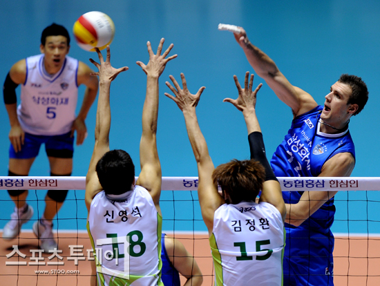 [스포츠투데이 정재훈 기자] 27일 오후 서울 장충체육관에서 열린 'NH 농협 2011-2012 V리그' 남자부 드림식스와 삼성화재의 경기에서 삼성화재 가빈이 공격을 시도하고 있다.