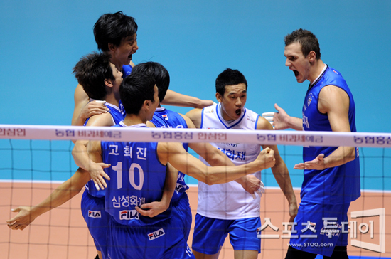 [스포츠투데이 정재훈 기자] 27일 오후 서울 장충체육관에서 열린 'NH 농협 2011-2012 V리그' 남자부 드림식스와 삼성화재의 경기에서 공격에 성공한 삼성화재 선수들이 환호하고 있다.
