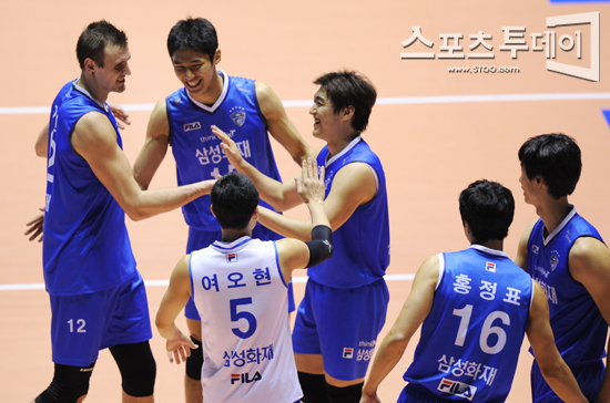[스포츠투데이 정재훈 기자] 27일 오후 서울 장충체육관에서 열린 'NH 농협 2011-2012 V리그' 남자부 드림식스와 삼성화재의 경기에서 가빈의 득점에 삼성화재 선수들이 기뻐하고 있다.