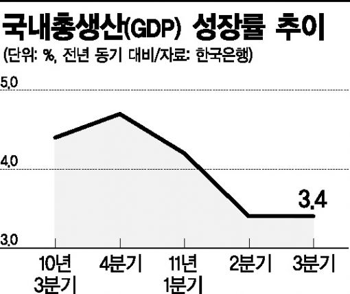 이와 함께 경제주체들의 심리지표도 꽁꽁 얼어붙어 향후 경기 전망을 더욱 불투명하게 하고 있다. 우리나라의 국내총생산(GDP) 성장률도 2분기 연속 3%대를 기록하는 등 연간 경제성장률이 정부 목표치(4.5%)에 훨씬 못 미친 3%대를 기록할 가능성이 높아졌다.