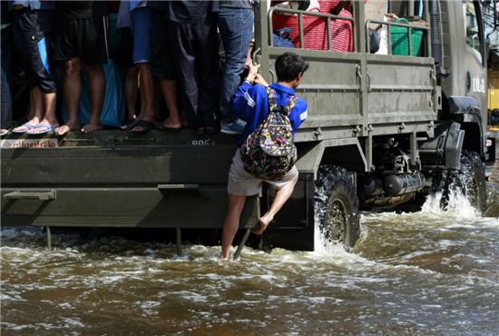 [방콕=AP/뉴시스] 홍수 위기를 겪고 있는 태국 방콕에서 1일 한 남성이 사람들을 가득 태운 군용 트럭 뒤에 매달려 가고 있다.