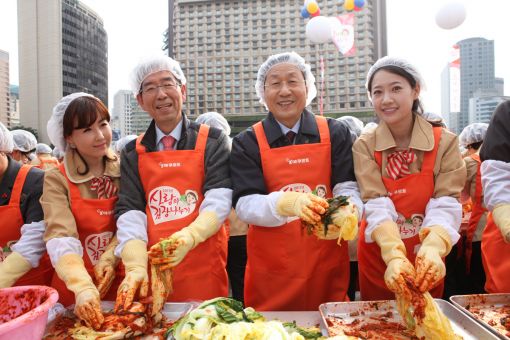[아시아경제 조강욱 기자] 8일 서울광장에서 열린 ‘2011 사랑의 김장 나누기’ 행사에서 박원순 서울시장(왼쪽)과 양기락 한국야쿠르트 사장이 김장을 담그고 있다.