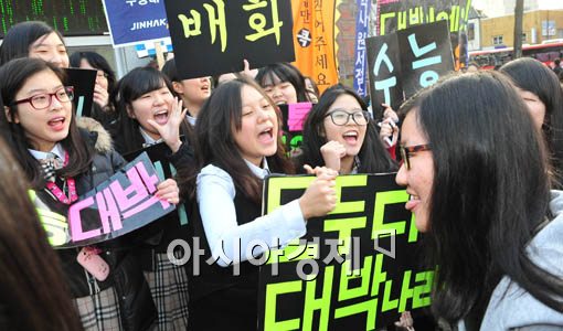 [아시아경제 윤동주 기자] 2012학년도 대학수학능력시험이 실시된 10일 서울 종로구 풍문여고앞에서 후배들이 열띤 수능 응원전을 하고 있다.