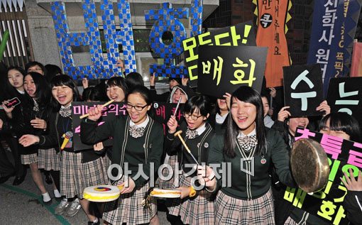 [아시아경제 윤동주 기자] 2012학년도 대학수학능력시험이 실시된 10일 서울 종로구 풍문여고앞에서 후배들이 열띤 수능 응원전을 하고 있다.