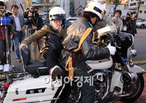 [아시아경제 윤동주 기자] 2012학년도 대학수학능력시험이 실시된 10일 서울 종로구 풍문여고앞에서 수험생 오토바이 수송 자원봉사대원들이 지각한 수험생들을 .
