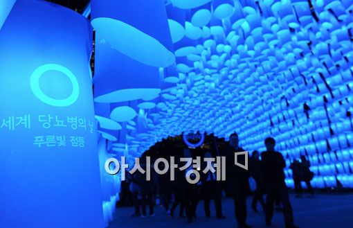 [아시아경제 양지웅 기자]'세계당뇨병의 날'인 14일 서울 청계천 장통교에서 대한당뇨병학회 주최로 열린 '희망의 푸른빛 터널' 점등식 행사에 많은 시민들이 발걸음을 옮기고 있다.
