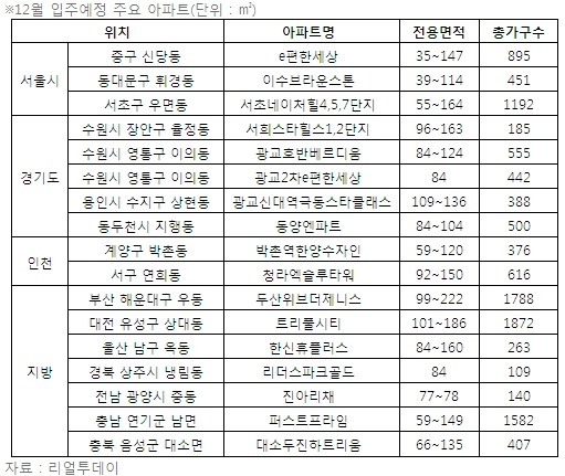 부동산 정보업체 리얼투데이에 따르면 12월 전국에서 입주예정 아파트(임대포함)는 2만507가구인 것으로 조사됐다. 이는 지난해 같은 기간 대비 46%(1만7243가구)가 줄어든 물량이다.