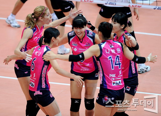 [인천=스포츠투데이 정재훈 기자] 22일 오후 인천 도원시립체육관에서 열린 'NH농협 2011-2012 V리그' 여자부 흥국생명과 도로공사의 경기에서 공격에 성공한 흥국생명 선수들이 환호하고 있다.